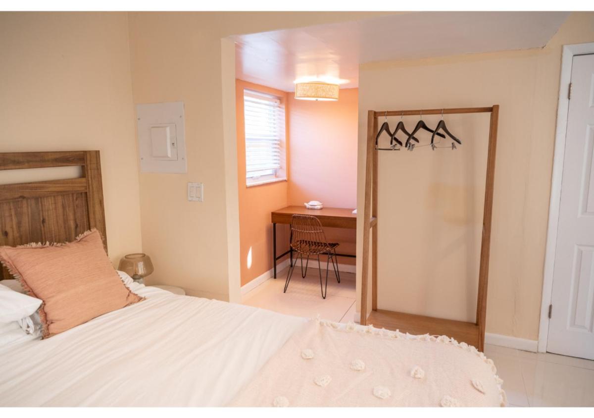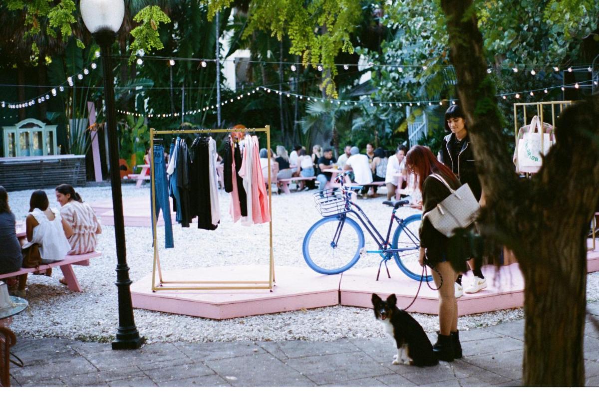 Photos highlight the lush garden courtyard, outdoor pool with loungers, and colorful common areas. Interiors show boho-style rooms with woven details and bright murals, while shared spaces feature coworking desks, community kitchens, and a lively bar-restaurant.